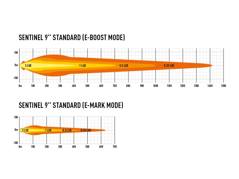 0.25 lx Line: 1414 metres / 632 metres (E-Boost / E-Mark Mode)