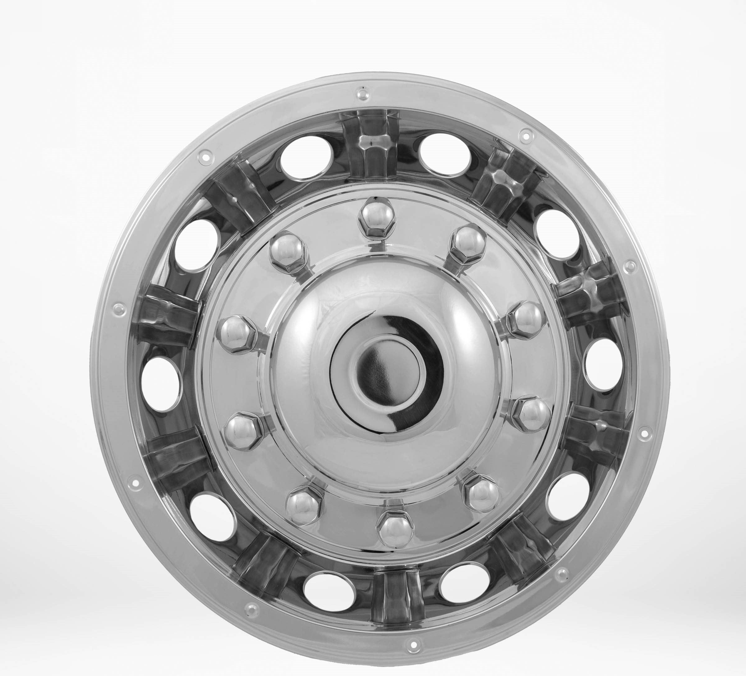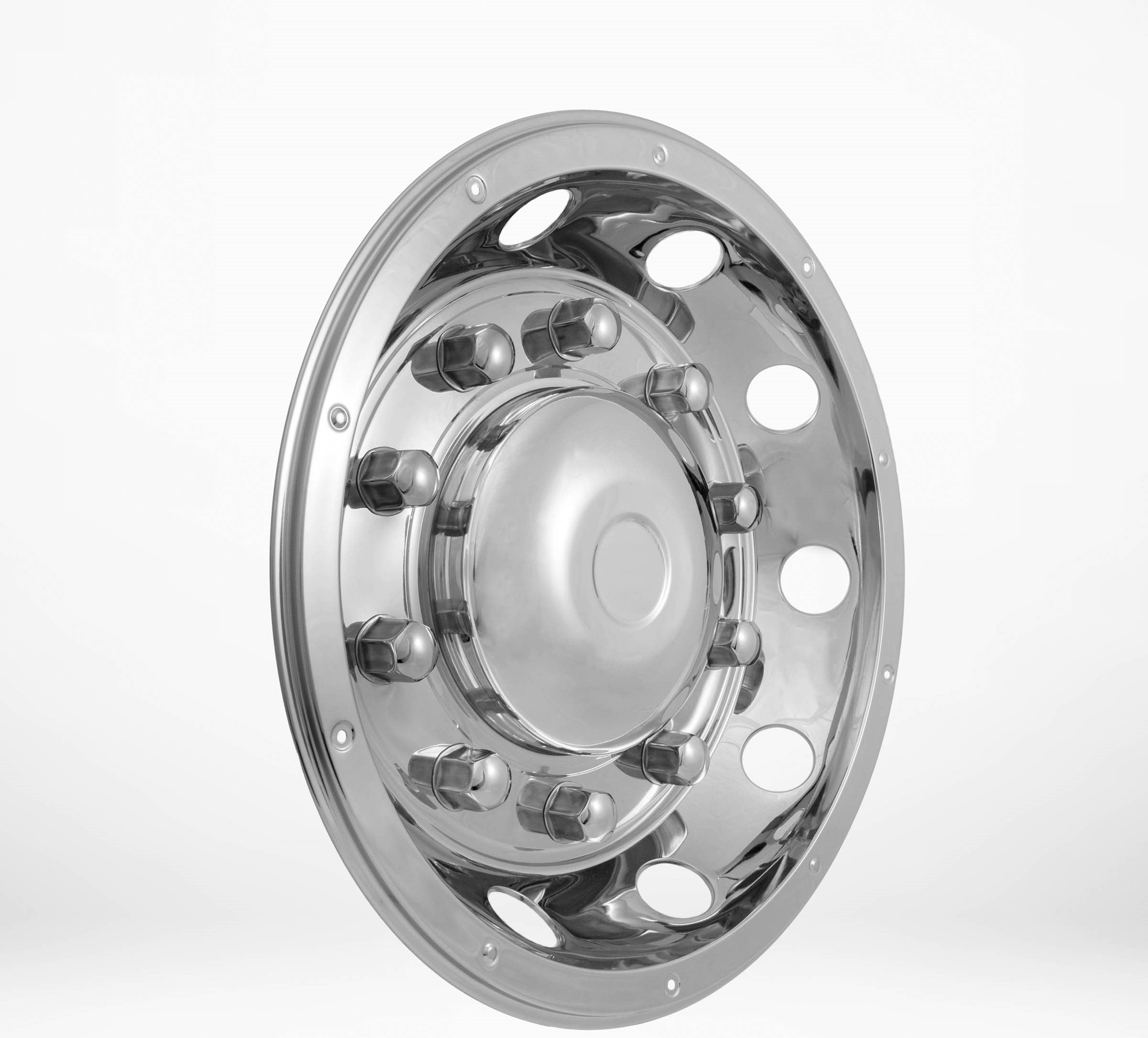 A pair of wheel covers made of stainless steel with an solid center for 22.5″ rims